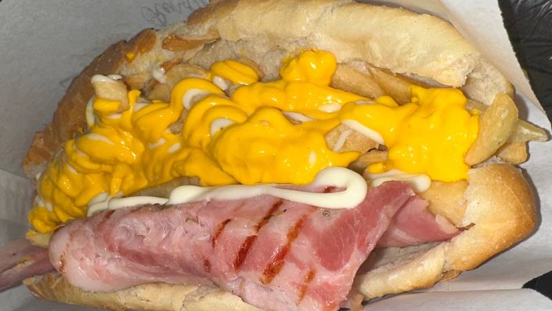 Panino, porchetta, patatine fritte, maionese, salsa cheddar.
