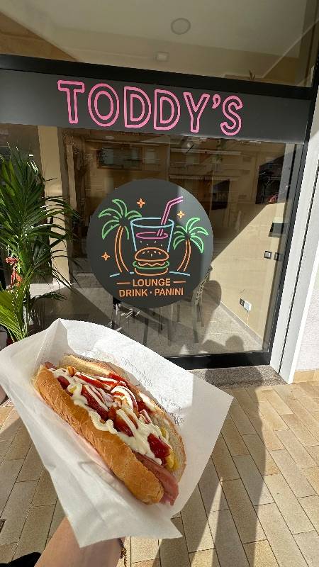Panino potato bun, doppio hamburger, cheddar, bacon e salsa Toddy's.