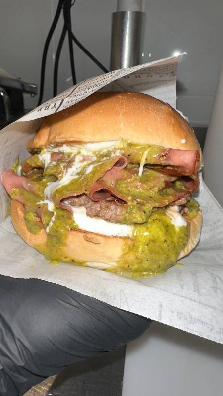 Panino rotondo con sesamo, hamburger 200 gr, burrata, crema di pistacchio, mortadella arrostita, sale e pepe.