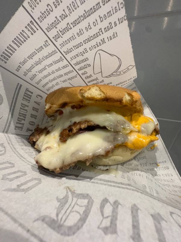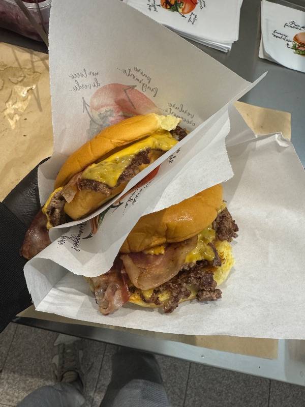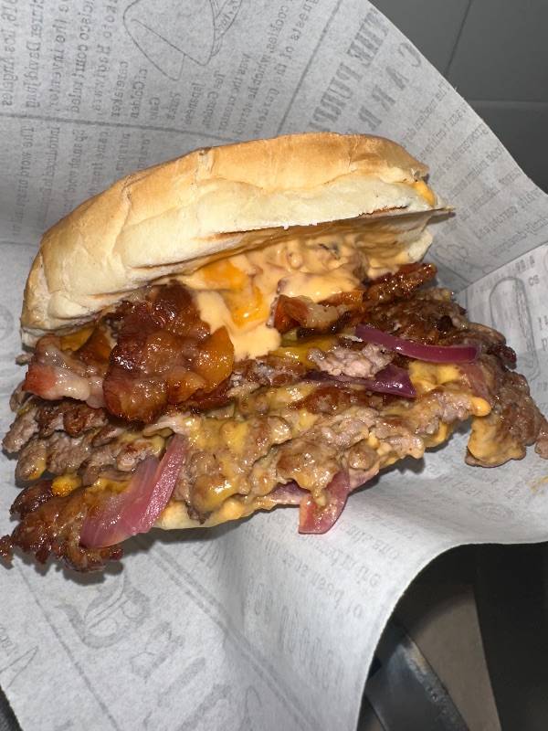Panino potato bun 100 gr, triplo hamburger smashato, triplo cheddar, triplo bacon, cipolla, salsa Toddy's.